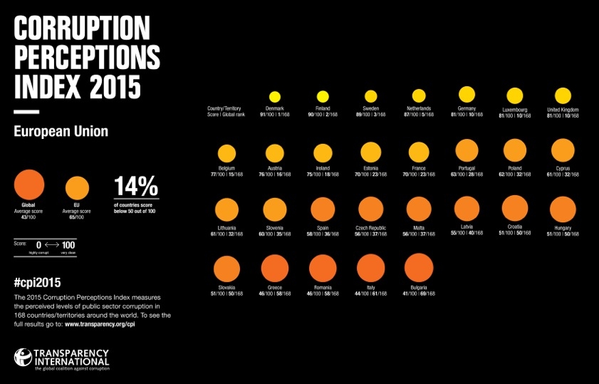 Дания, Финландия и Швеция са най-малко корумпирани. Сред отличниците в първата десетка на класацията са също Норвегия, Холандия, Швейцария, Сингапур и Канада. Десета е Германия, заедно с Великобритания. САЩ си разделят 16-о място, заедно с Австрия.